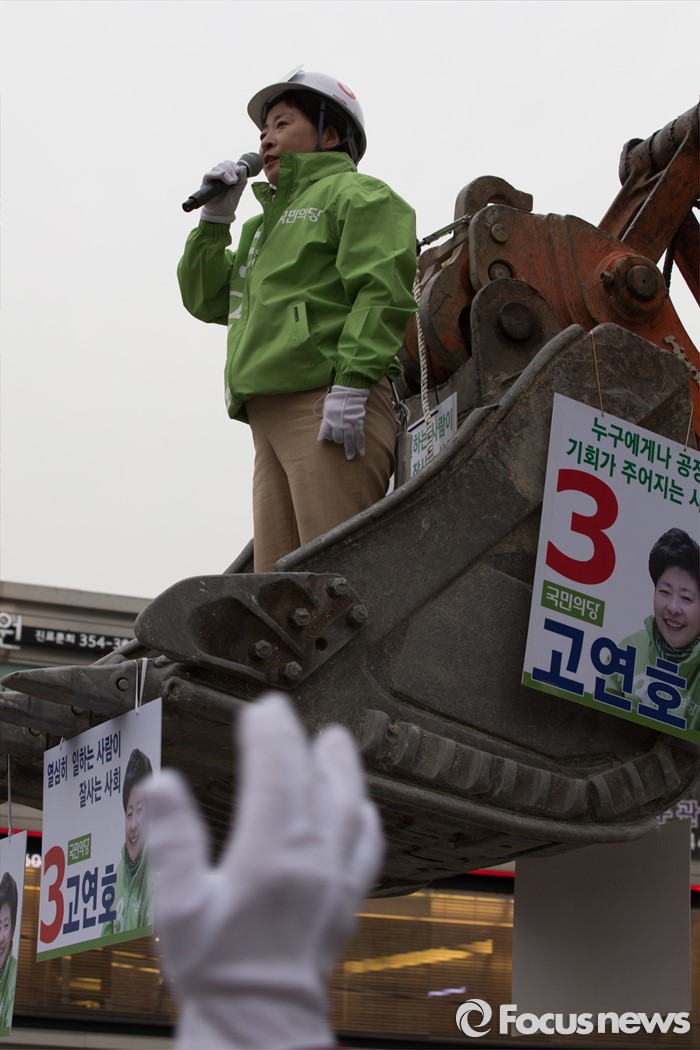 (서울=포커스뉴스) 6일 오후 서울 은평구 연신내 물빛공원에서 고연호 국민의당 은평구을 후보가 포클레인 위에서 유세를 하고 있다.