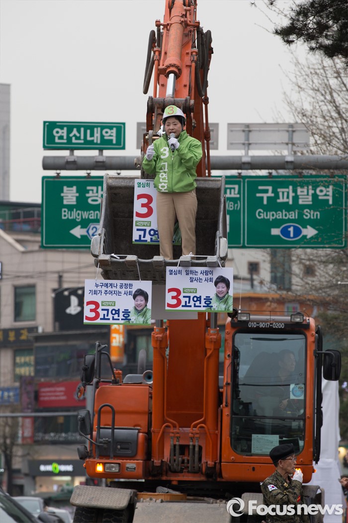 (서울=포커스뉴스) 6일 오후 서울 은평구 연신내 물빛공원에서 고연호 국민의당 은평구을 후보가 포클레인 위에서 유세를 하고 있다.