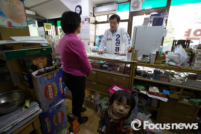 (서울=포커스뉴스) 6일 오후 서울 영등포구 한양아파트 사거리 일대에서 신경민 더불어민주당 영등포구을 후보자가 유세를 하고 있다.