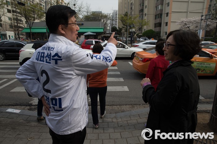 (서울=포커스뉴스) 6일 오후 서울 영등포구 한양아파트 사거리 일대에서 신경민 더불어민주당 영등포구을 후보자가 유세를 하고 있다.