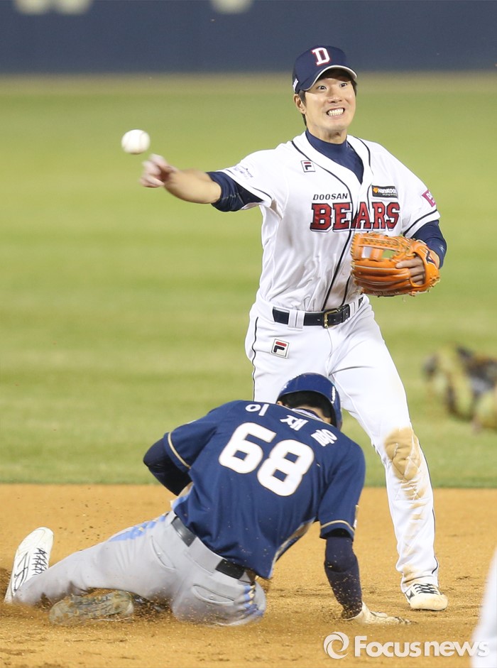 (서울=포커스뉴스) 6일 서울 잠실구장에서 열린 2016 프로야구 NC-두산 경기 8회초 무사 1루에서 NC 이종욱의 1루땅볼때 두산 유격수 김재호가 1루주자 이재율을 2루에서 아웃시킨후 1루로 송구해 병살플레이를 시도하고 있다.