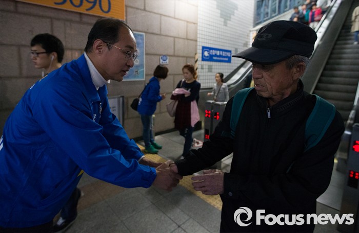 (인천=포커스뉴스) 제20대 총선에 출마한 이성만 더불어민주당 부평갑 후보가 6일 오후 인천 부평구 부개역 인근에서 선거운동을 하고 있다.