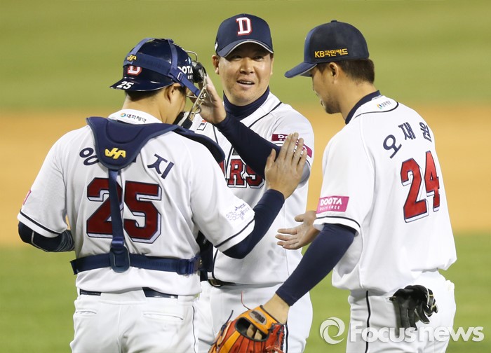 (서울=포커스뉴스) 6일 서울 잠실구장에서 열린 2016 프로야구 NC-두산 경기에서 세이브를 올린 이현승이 포수 양의지, 2루수 오재원과 승리의 하이파이브를 하고 있다.