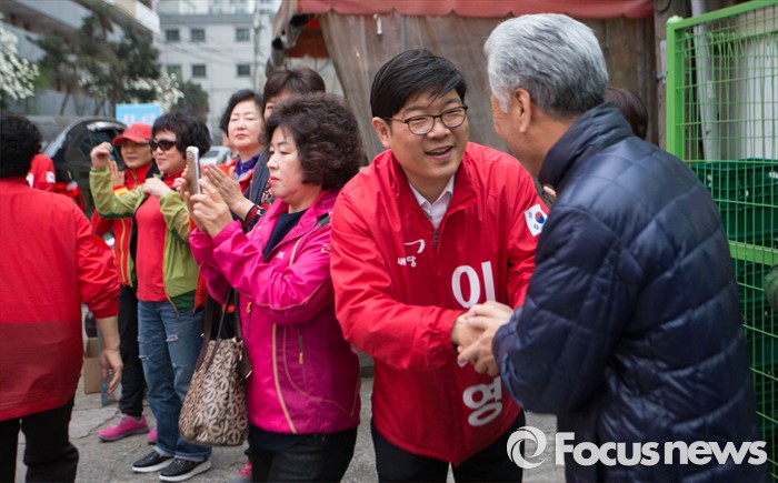 (서울=포커스뉴스) 6일 오후 서울 강동구 천호동 인근의 한 아파트 앞에서 이재영 새누리당 후보가 유세를 펼치고 있다.