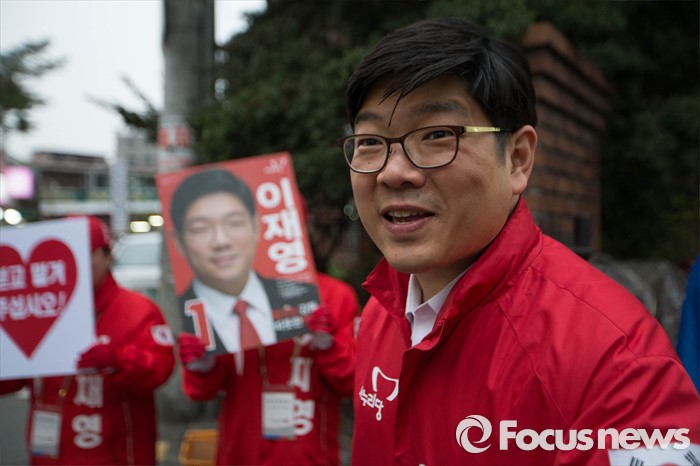 (서울=포커스뉴스) 6일 오후 서울 강동구 천호동 인근의 한 아파트 앞에서 이재영 새누리당 후보가 유세를 펼치고 있다.