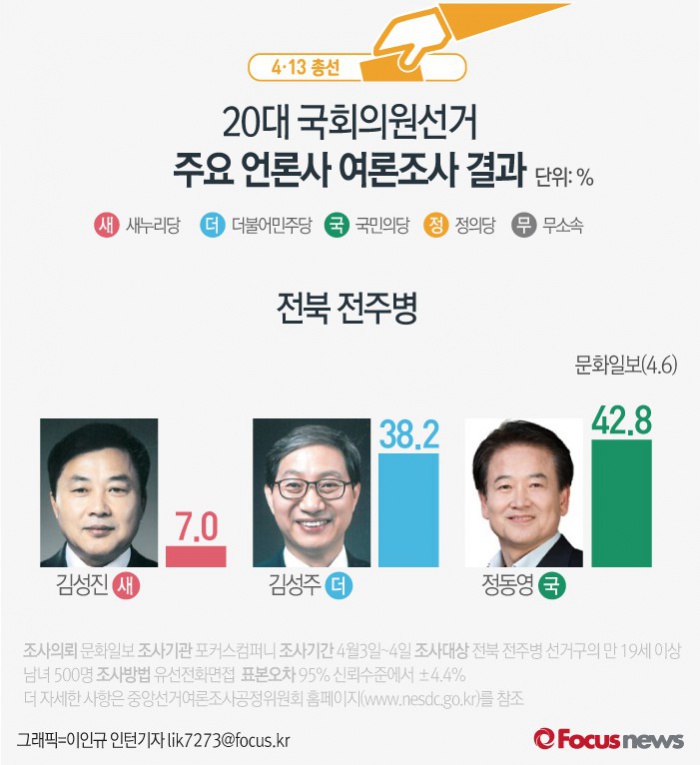 문화일보가 여론조사기관 포커스컴퍼니에 의뢰해 6일 발표한 결과에 따르면 정동영 후보가 42.8%의 지지율을 기록해 김성주 후보(38.2%)에 4.6%p 앞섰다. 김성진 새누리당 후보는 7.0%로 조사됐다.