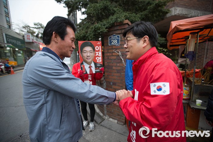 (서울=포커스뉴스) 6일 오후 서울 강동구 천호동 인근의 한 아파트 앞에서 이재영 새누리당 후보가 유세를 펼치고 있다.