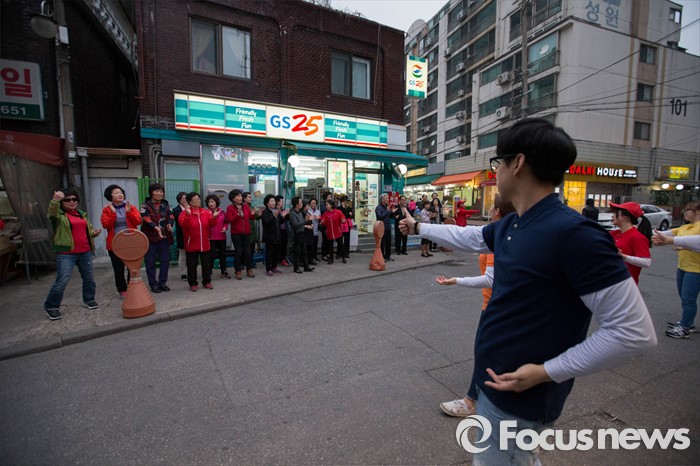 (서울=포커스뉴스) 6일 오후 서울 강동구 천호동 인근의 한 아파트 앞에서 이재영 새누리당 후보가 유세를 펼치고 있다.