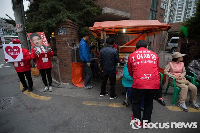 (서울=포커스뉴스) 6일 오후 서울 강동구 천호동 인근의 한 아파트 앞에서 이재영 새누리당 후보가 유세를 펼치고 있다.