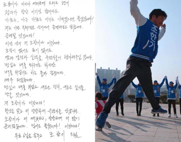 조한기 후보는 이날 자신의 페이스북을 통해 "정의가 항상 이기지는 않더라도 가끔은 이기는 사회였으면 좋겠다"며 "이번 선거에서 증명하고 싶다. 증명할 것"이라고 밝혔다.