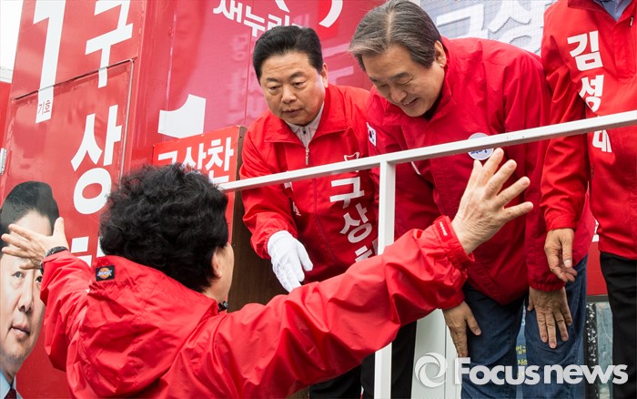 (서울=포커스뉴스) 7일 오전 서울 강서구 화곡역 사거리에서 강서구갑ㆍ을ㆍ병 후보 합동 지원유세에 나선 김무성 새누리당 대표가 한 여성 지지자와 인사하고 있다.