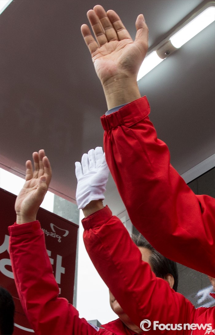(서울=포커스뉴스) 7일 오전 서울 강서구 화곡역 사거리에서 강서구갑ㆍ을ㆍ병 후보 합동 지원유세에 나선 김무성(맨 왼쪽) 새누리당 대표가 후보들과 함께 유권자들에게 지지를 호소하고 있다.