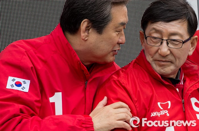 (서울=포커스뉴스) 7일 오전 서울 강서구 화곡역 사거리에서 강서구갑ㆍ을ㆍ병 후보 합동 지원유세에 나선 김무성(왼쪽) 새누리당 대표가 유영 강서구병 후보와 대화하고 있다.