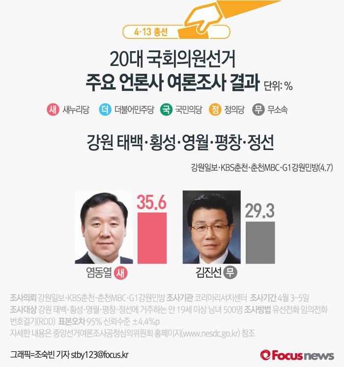 (서울=포커스뉴스) 강원일보·KBS춘천·춘천MBC·G1강원민방이 공동으로 여론조사기관 코리아리서치에 의뢰해 7일 발표한 자료에 따르면 강원 태백·횡성·영월·평창·정선에서 새누리당 염동열 후보의 지지율은 35.6%, 무소속 김진선 후보의 지지율은 29.3%로 조사됐다.