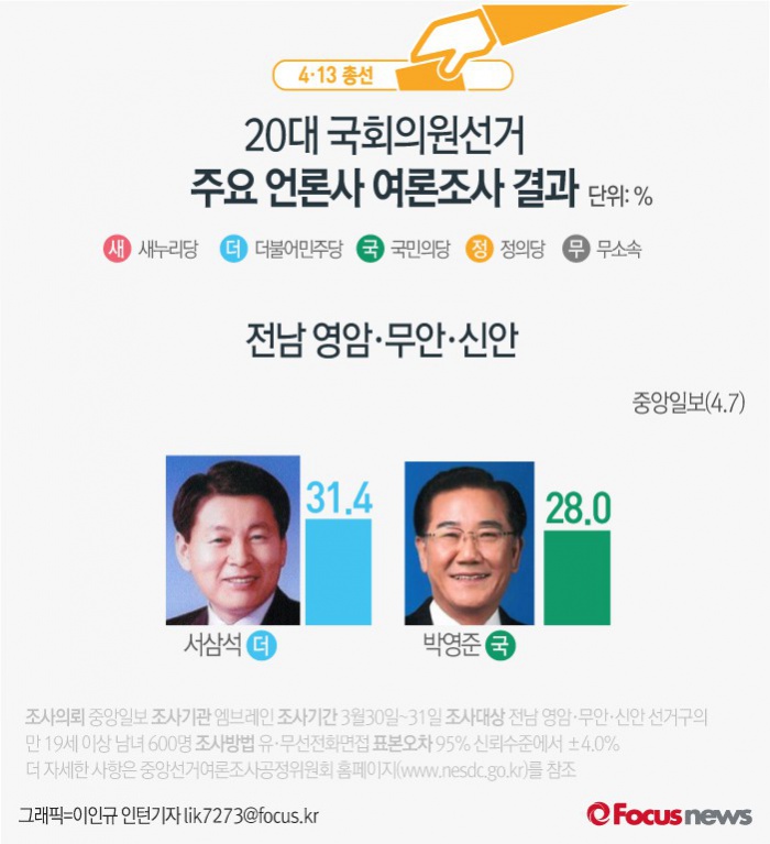 (서울=포커스뉴스) 중앙일보가 여론조사기관 엠브레인에 의뢰해 7일 발표한 결과에 따르면 전남 영암 무안 신안에서 더불어민주당 서삼석 후보의 지지율은 31.4%, 국민의당 박영준 후보의 지지율은 28.0%인 것으로 나타났다.