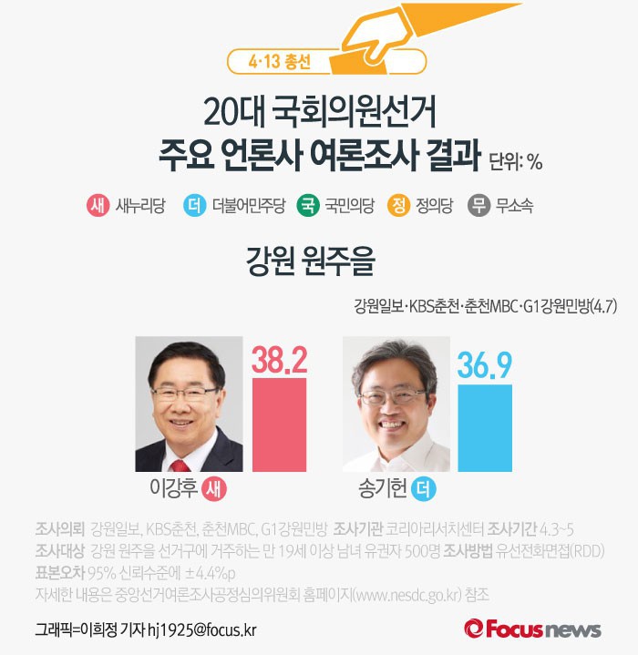 (서울=포커스뉴스) KBS춘천, 춘천MBC, G1강원민방, 강원일보가 공동으로 코리아리서치에 의뢰해 7일 발표한 강원 원주을 여론조사 결과에 따르면 새누리당 이강후 후보의 지지율은 38.2%, 더불어민주당 송기헌 후보의 지지율은 36.9%로 나타났다.