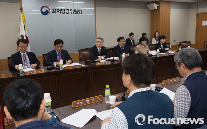 (세종=포커스뉴스) 7일 오전 세종시 정부세종청사 고용노동부 최저임금위원회 대회의실에서 열린 제1차 전원회의에서 박준성 위원장이 회의를 주재하고 있다.