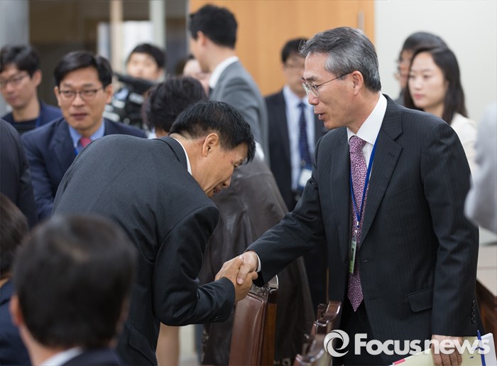 (세종=포커스뉴스) 7일 오전 세종시 정부세종청사 고용노동부 최저임금위원회 대회의실에서 열린 제1차 전원회의에서 박준성 위윈장이 위원들과 인사를 하고 있다.