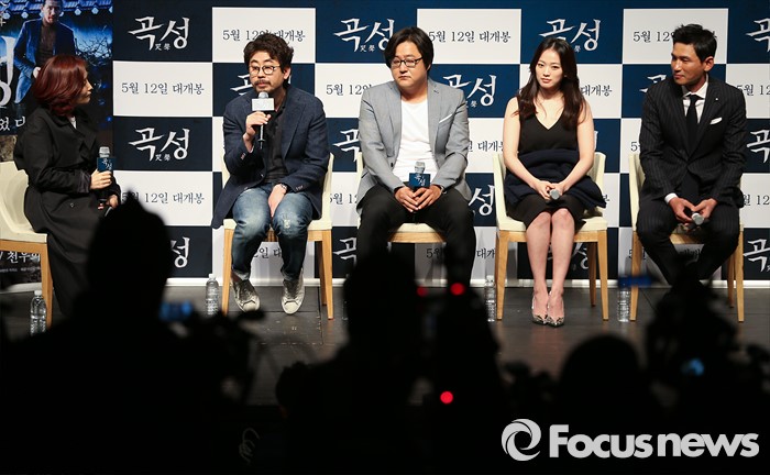 (서울=포커스뉴스) 7일 오전 서울 강남구 압구정 CGV에서 열린 영화 '곡성' 제작보고회에 참석한 나홍진(왼쪽 두번째)감독이 인사말을 하고 있다. 왼쪽부터 사회자 박경림, 나홍진 감독, 배우 곽도원, 천우희, 황정민.