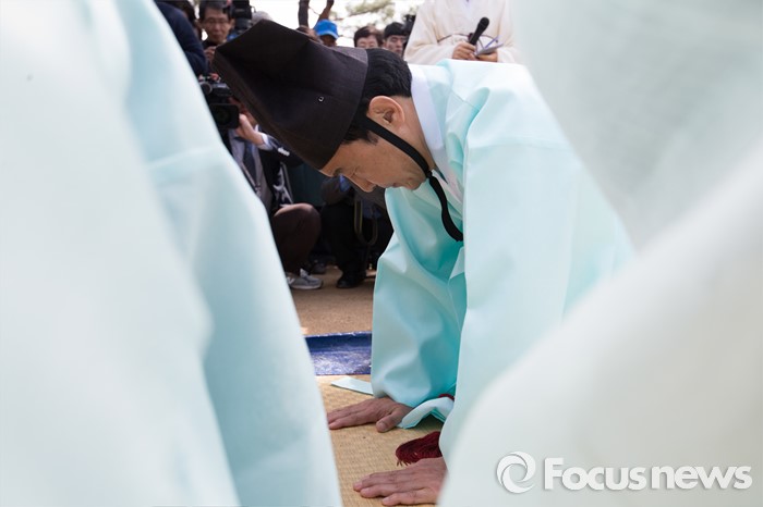 (남양주=포커스뉴스) 7일 오전 경기 남양주 다산유적지에서 손학규 전 더불어민주당 상임고문이 초헌관으로 참석해 다산 정약용 선생 180주기 묘제·헌다례를 하고 있다.