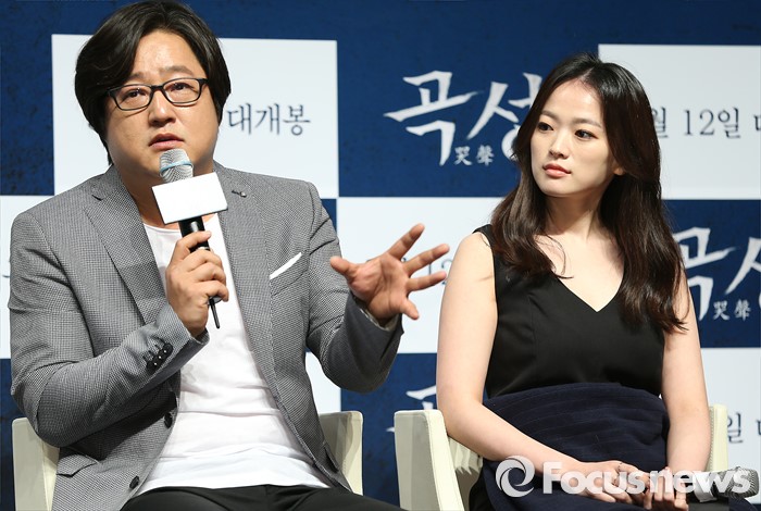 (서울-포커스뉴스) 7일 오전 서울 강남구 압구정 CGV에서 열린 영화 '곡성' 제작보고회에 참석한 배우 곽도원이 취재진의 질문에 답하고 있다. 왼쪽부터 배우 곽도원, 천우희.