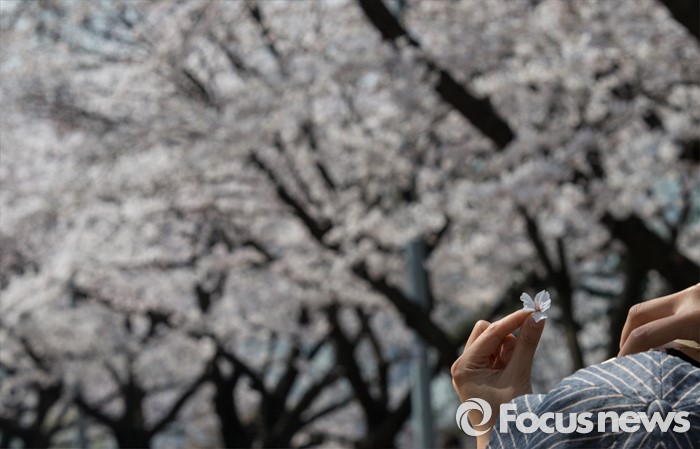 (서울=포커스뉴스) 7일 오전 서울 여의도 윤중로 일대에서 열린 벚꽃축제를 찾은 상춘객이 사진을 찍고 있다.