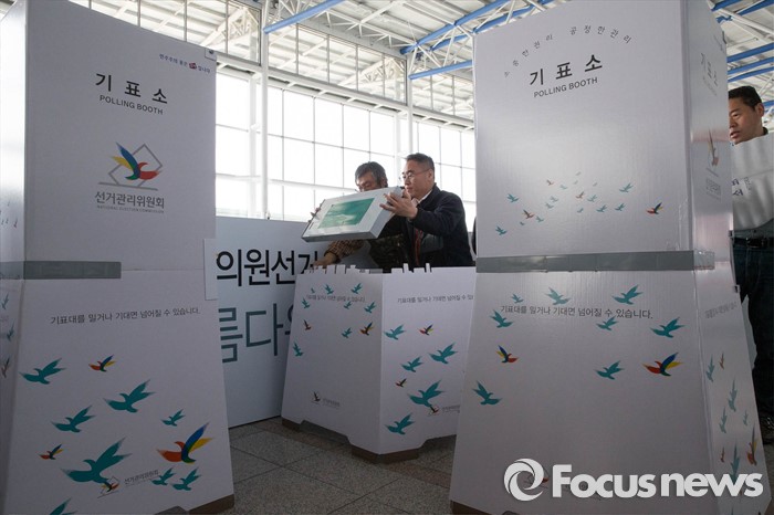 (서울=포커스뉴스) 20대 총선을 6일 앞둔 7일 오전 서울 용산구 서울역 3층 맞이방에 사전투표소가 설치되고 있다.