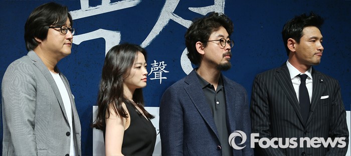 (서울=포커스뉴스) 7일 오전 서울 강남구 압구정 CGV에서 열린 영화 '곡성' 제작보고회에 참석한 배우 곽도원, 천우희, 나홍진(감독), 황정민이 포토타임을 갖고 있다.