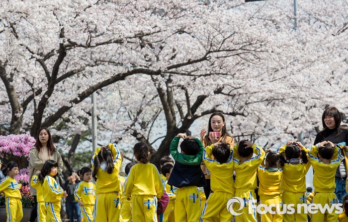 (서울=포커스뉴스) 7일 오전 서울 여의도 윤중로 일대에서 열린 벚꽃축제를 찾은 어린이들이 나들이를 즐기고 있다.