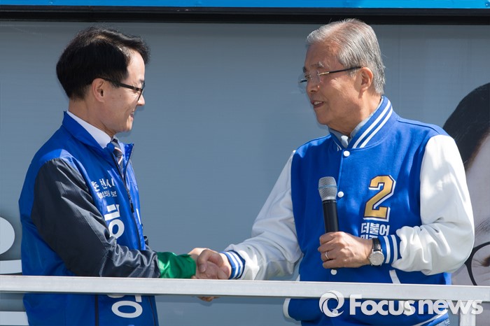(춘천=포커스뉴스) 7일 강원도 춘천풍물시장 인근에서 김종인 더불어민주당 비대위 대표와 허영 더불어민주당 춘천 후보가 유세를 펼치며 악수를 하고 있다.