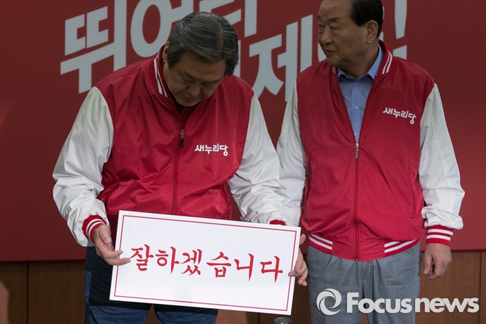 (서울=포커스뉴스) 김무성(왼쪽) 새누리당 대표가 7일 오전 서울 여의도 당사에서 열린 공동선대위원장 긴급회의에 참석해, 투표독려 홍보문구를 보고 있다. 오른쪽은 서청원 최고위원.