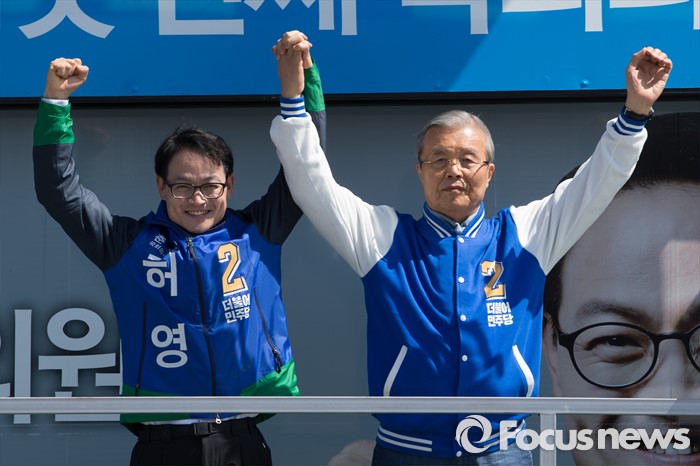 (춘천=포커스뉴스) 7일 강원도 춘천풍물시장 인근에서 김종인 더불어민주당 비대위 대표와 허영 더불어민주당 춘천 후보가 유권자들에게 지지를 호소하고 있다.