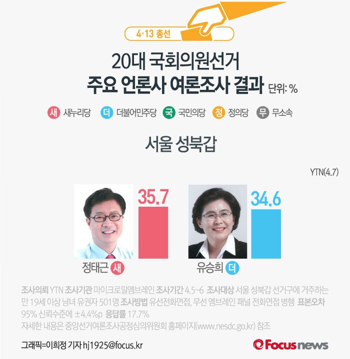 (서울=포커스뉴스) YTN이 마이크로밀엠브레인에 의뢰해 7일 발표한 서울 성북갑 여론조사 결과에 따르면 새누리당 정태근 후보의 지지율은 35.7%, 더불어민주당 유승희 후보의 지지율은 34.6%로 나타났다.