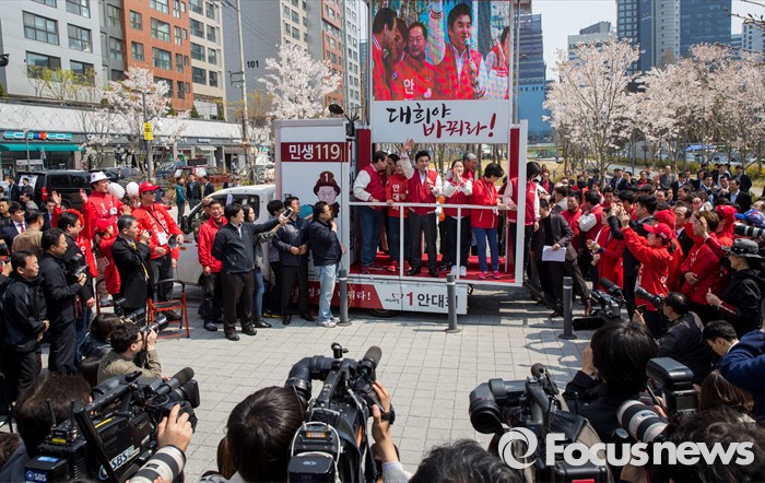 (서울=포커스뉴스) 7일 오후 서울 마포구 늘장공원에서 열린 안대희 새누리당 마포갑 후보 집중유세에 참석한 김무성 대표와 안 후보, 서청원 최고위원, 원유철 원내대표가 유권자들의 지지를 호소하고 있다.