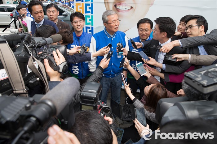 (원주=포커스뉴스) 김종인 더불어민주당 비대위 대표가 7일 오후 강원도 원주중앙시장 인근에서 송기헌 더불어민주당 원주을 후보, 권성중 더불어민주당 원주갑 후보와 유세를 마치고 취재진의 질문에 답변을 하고 있다.