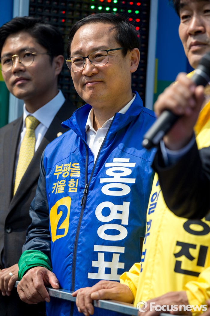 (인천=포커스뉴스) 홍영표 더불어민주당 인천광역시 부평구을 후보가 7일 오후 인천광역시 지하철1호선 주안역 남광장에서 열린 인천 지역 합동유세에 참석 하고 있다.