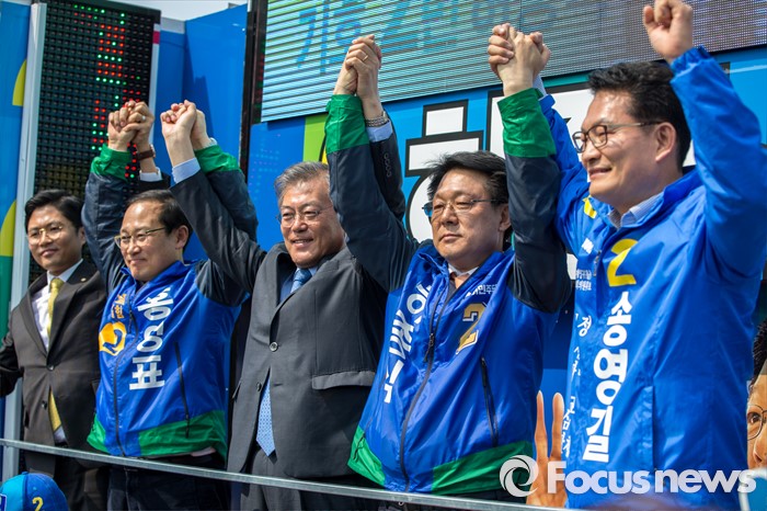 (인천=포커스뉴스) 문재인 더불어민주당 전 대표가 7일 오후 인천광역시 지하철1호선 주안역 남광장에서 열린 인천 지역 합동유세에 앞서 후보들과 손을 맞잡고 있다.