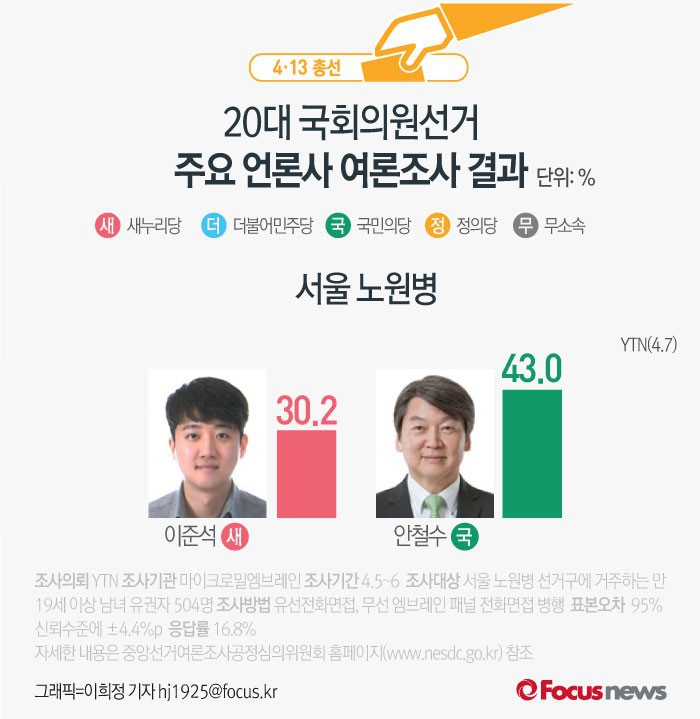 (서울=포커스뉴스) YTN이 마이크로밀엠브레인에 의뢰해 7일 발표한 서울 노원병 여론조사 결과에 따르면 새누리당 이준석 후보의 지지율은 30.2%, 국민의당 안철수 후보의 지지율은 43.0%로 나타났다.