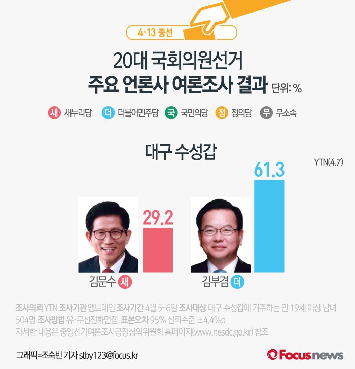 (서울=포커스뉴스) YTN이 여론조사기관 엠브레인에 의뢰해 7일 발표한 결과에 따르면 대구 수성갑에서 더민주 김부겸 후보의 지지율은 61.3%, 새누리당 김문수 후보의 지지율은 29.2%인 것으로 나타났다.