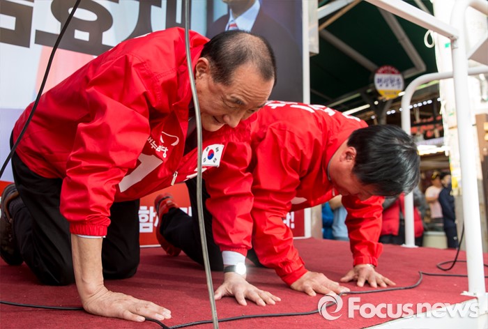 (서울=포커스뉴스) 7일 오후 서울 성북구 장위시장 앞에서 열린 김효재 새누리당 성북구을 후보 지원유세장에서 김 후보(왼쪽)이 사죄의 절을 하고 있다.