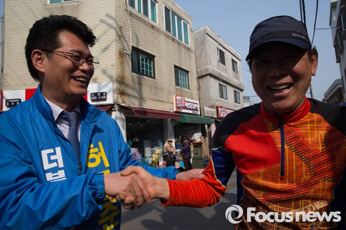 (서울=포커스뉴스) 20대 총선을 6일 앞둔 7일 오후 서울 동작구 남성역 골목시장에서 허동준 더불어민주당 동작구을 후보가 선거운동을 하고 있다.