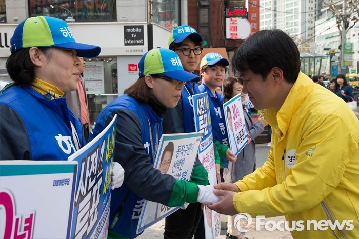 (서울=포커스뉴스) 20대 총선을 6일 앞둔 7일 오후 서울 동작구 남성역 골목시장 인근에서 김종철 정의당 동작구을 후보가 허동준 더민주측 선거운동원들과 악수하고 있다.