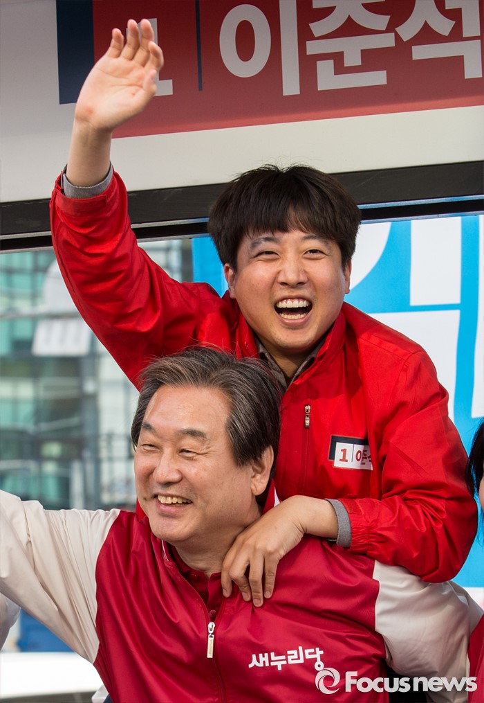 (서울=포커스뉴스) 7일 오후 서울 노원구 롯데백화점 인근에서 이준석 새누리당 노원구병 후보 지원유세에 나선 김무성 대표가 이 후보를 업어주고 있다.