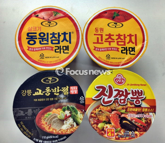7일 세븐일레븐 컵라면 매대에서 동원참치라면과 같은 줄에 진열돼 있는 동원참치·동원고추참치와 오뚜기 진짬뽕 큰컵, PB 강릉교동반점 직화짬뽕 컵라면을 비교대상으로 선정했다.