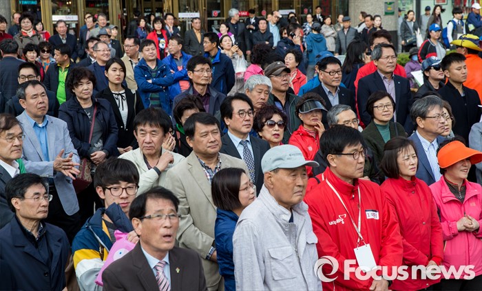 (서울=포커스뉴스) 7일 오후 서울 노원구 롯데백화점 인근에서 이준석 새누리당 노원구병 후보 지원유세에서시민들이 김무성 대표의 지원발언을 경청하고 있다.