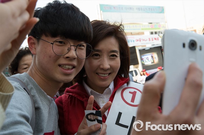 | △ 시민들과 사진 찍는 나경원 후보 |