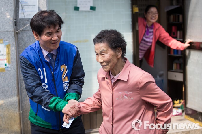 △ 할머니에게 인사하는 이용선 후보