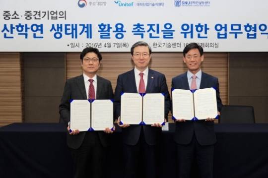 (서울=포커스뉴스) 중소기업청(이하 중기청)은 대학산업기술지원단(주관기관), SNU공학컨설팅센터와 7일 '중소·중견기업의 산학연 생태계 활용촉진을 위한 업무협약(MOU)'을 체결했다.