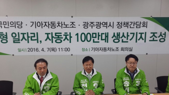 박주기 기아차 노조 지회장은 "자동차 산업은 친환경 미래형 자동차로 가고 있으며, 이는 일상적인 먹거리 문제와도 연결 된다"면서 "자동차 산업 발전에 정치권이 많은 관심과 지원을 해 달라. 100만대 생산을 국민의당 당 공약으로 채택해 달라"고 요청했다.