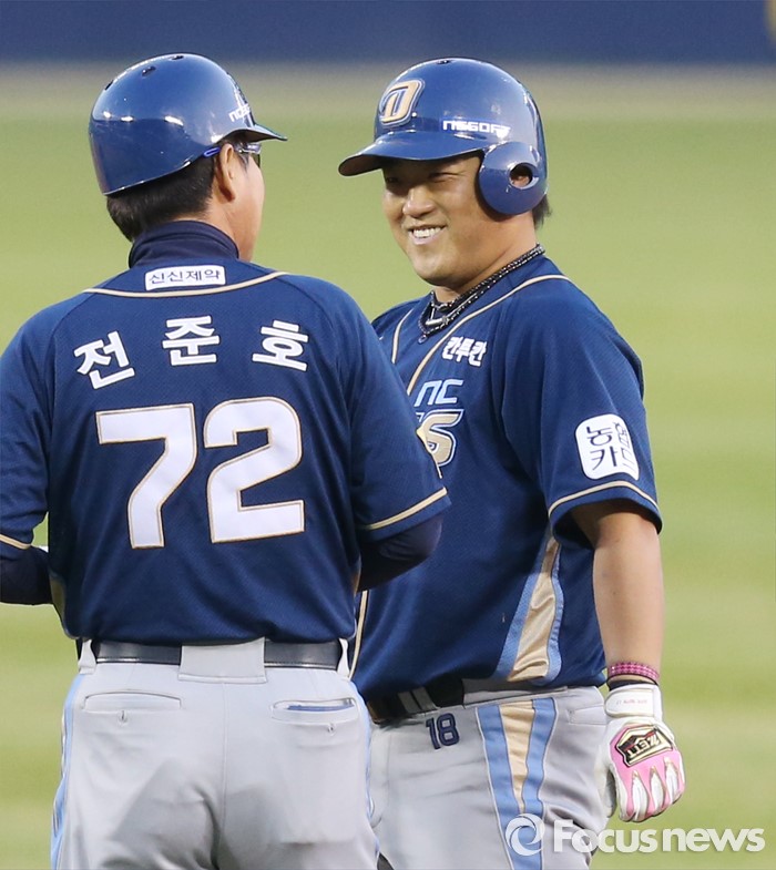 (서울=포커스뉴스) 7일 서울 잠실구장에서 열린 2016 프로야구 NC-두산 경기 1회초 2사 1,2루에서 NC 박석민이 우익선상으로 빠지는 2타점 2루타를 치고 전준호 코치의 축하를 받고 있다.